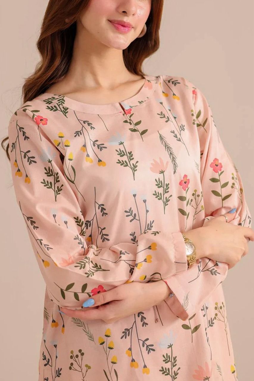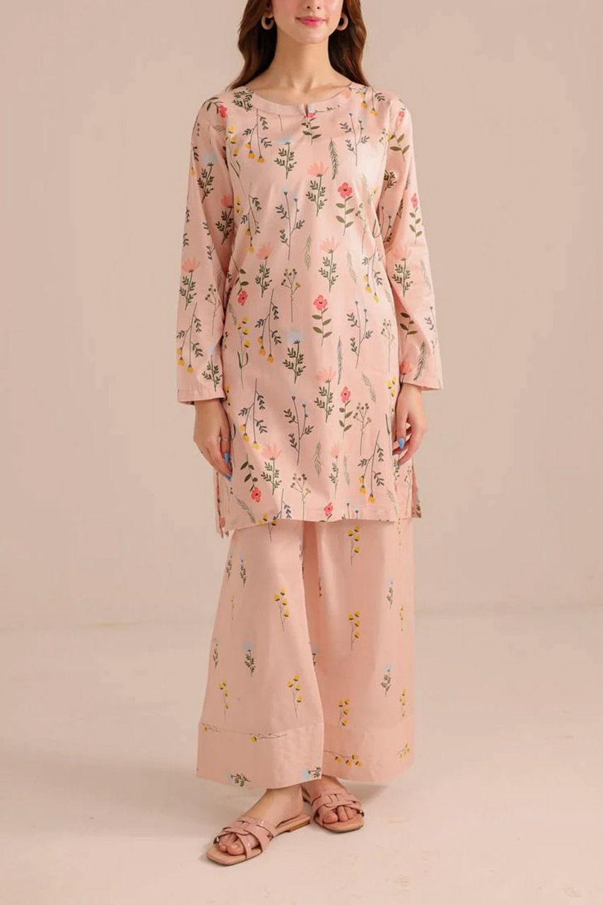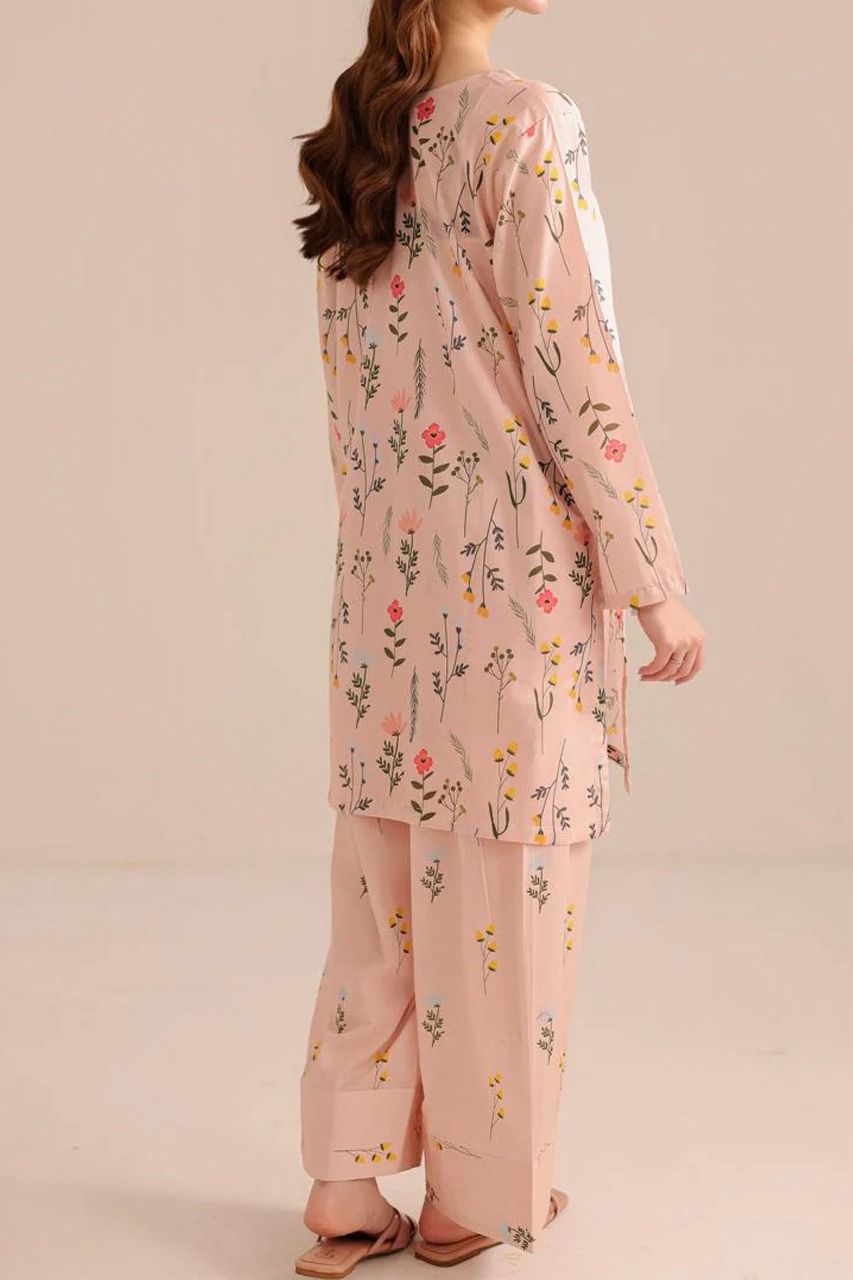 - Colour: The predominant colour is a light peach or blush pink. The outfit has a delicate print featuring small, scattered floral and plant motifs in various soft colours, including shades of green, yellow, blue, and white.