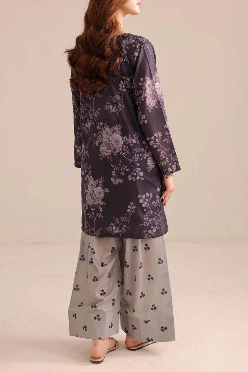 - Colour: The top (kameez) is a dark grey or charcoal colour with a large, subtle floral print in a lighter grey or mauve tone. The bottom (trousers) are a lighter grey colour with a small, repeated motif print in a darker shade.