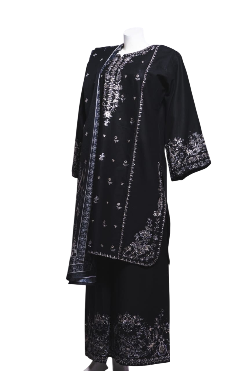 - Colour: The base colour of the suit is a solid black. The intricate embroidery or print work on the shirt, sleeves, and trousers is in a contrasting metallic or off-white colour, giving it a silver-grey appearance.